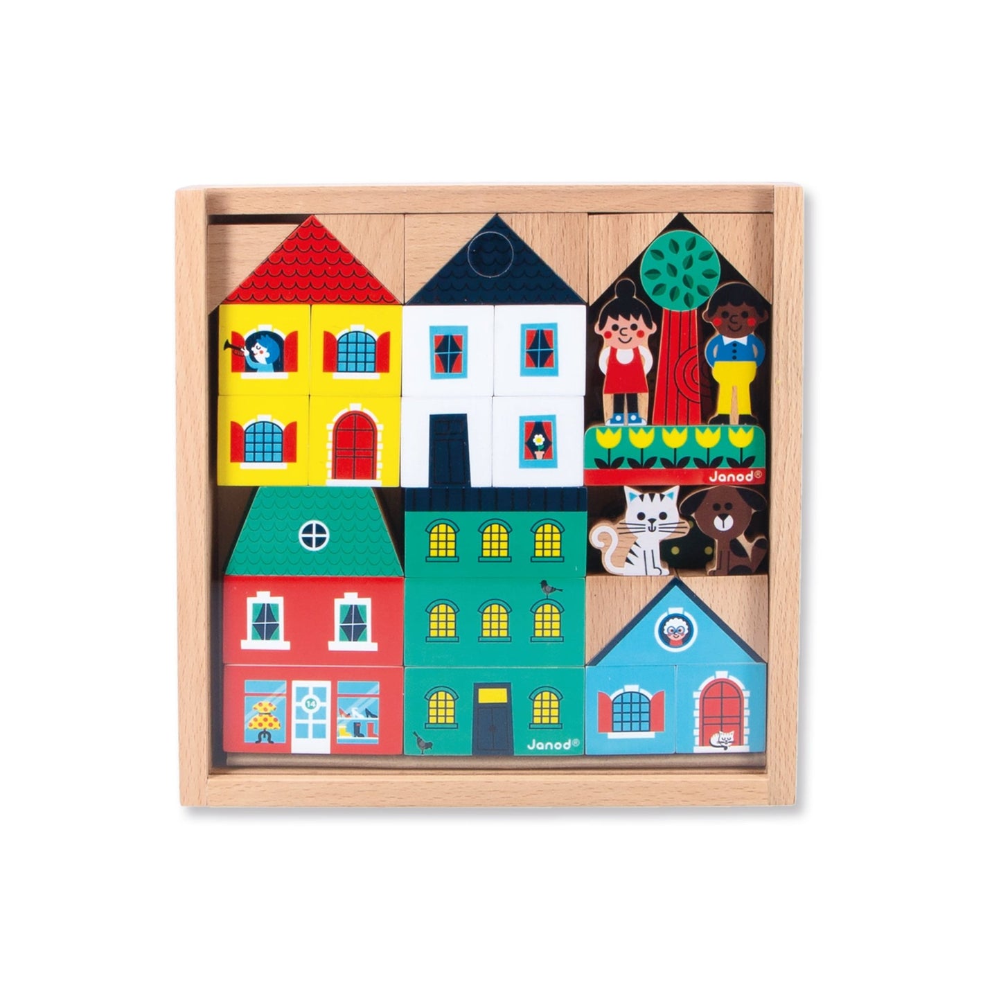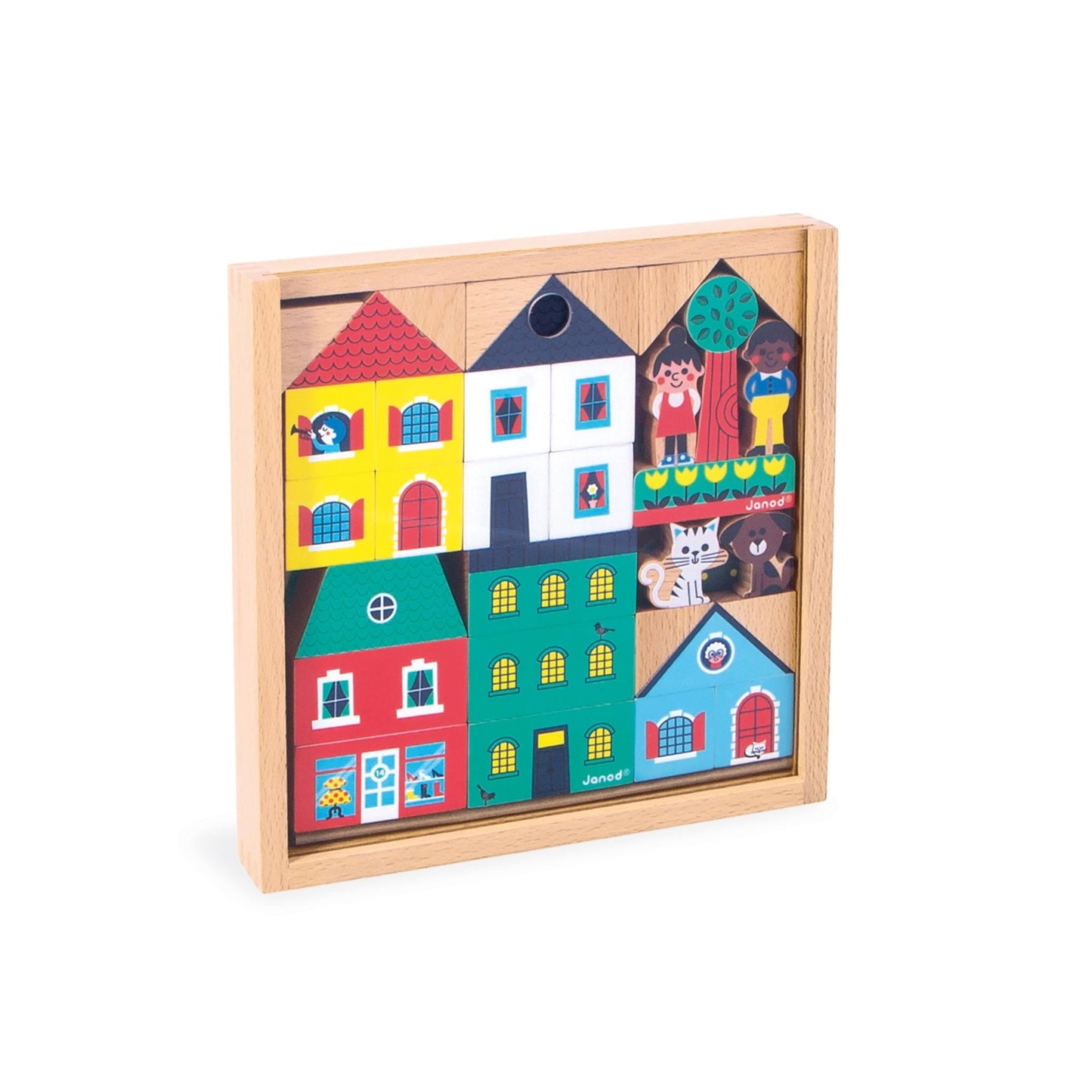 Take to the skies! With this set of wooden blocks and figures, children from the age of 2 can build their own little town. With a total of 36 solid wood elements, this building set contains: 25 cubes to assemble houses and buildings, 5 decorative elements to give the surroundings even more depth, and 6 characters and animals. One- or two-story house? Colourful, pointed or flat roof? With their wooden blocks, children develop their creativity and imagination, as well as their dexterity. Little ones love to stack endlessly, while older children invent their own worlds. Funny stories and crazy adventures are sure to unfold in this colourful city! All you have to do is follow the pattern to arrange everything like a jigsaw puzzle, and slide the transparent lid to admire the result. The wow effect is guaranteed when you open the set! This set of City cubes and figures is part of our Cross Roads collection: a series of playmats with circuits, made even more fun when complemented by our assortments of cubes and small wooden vehicles. This set is particularly suited to the City playmat, but can also be combined with other mats in the range. It's made from FSC™-certified wood from sustainably managed forests. So, see you in front of the red house!