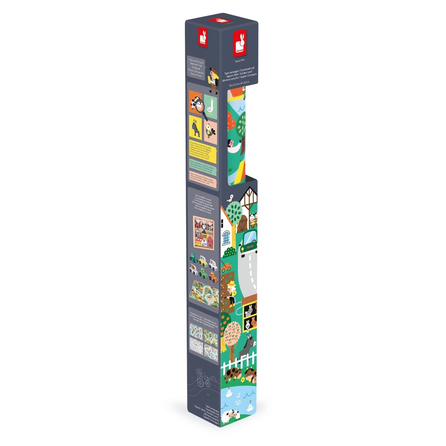 Ah, the countryside! In this bucolic, pastoral setting, we pass from the farm to the forest, and even through the equestrian centre! This countryside playmat is suitable for children aged 2 and over. It has a wide, long road, so you can take the key to the fields and imagine endless stories! On their play mat with circuit, little ones enjoy winding country roads in search of hidden elements, like a search and find game. They'll spot the wolf in the forest, the farmer in his tractor, and be amused by the little ducks crossing the river... There are so many buildings, animals and characters represented! We start by watering the vegetable garden, then head off to help the shepherd look after his sheep, before heading off to the riding school for a horse ride. With their fabric play mat, children develop their imagination and vocabulary, as well as their sense of observation. Little ones can even discover colours and numbers from 1 to 10! Another plus for this children's play mat: it's non-slip! Perfect for rolling toy cars on, or simply for little ones who like to keep moving. In its 120 x 78 cm format, this children's room mat offers further play possibilities with its accessories (sold separately): it can be completed with a range of vehicles and wooden blocks, also from our Cross Roads range. You can also link this farm mat with other mats in the collection, to create a giant play area and extend children's adventures. In fact, the circuits are designed to link up on all 4 sides of the mat. How about pitching the tent tonight?