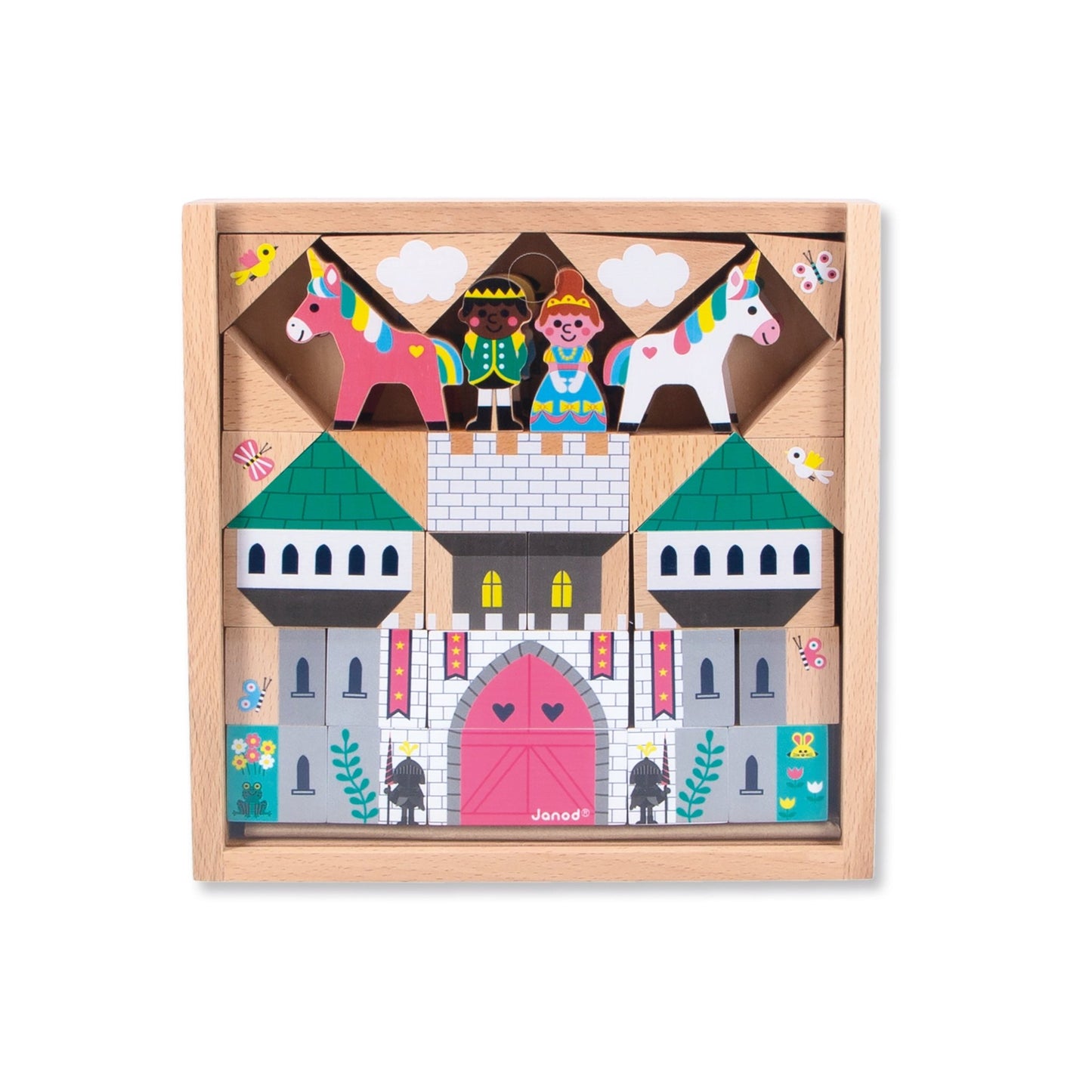 Janod enchanted kingdom building blocks set in a wooden box with sliding plastic cover.