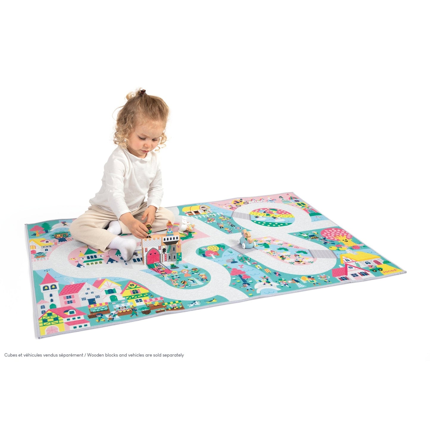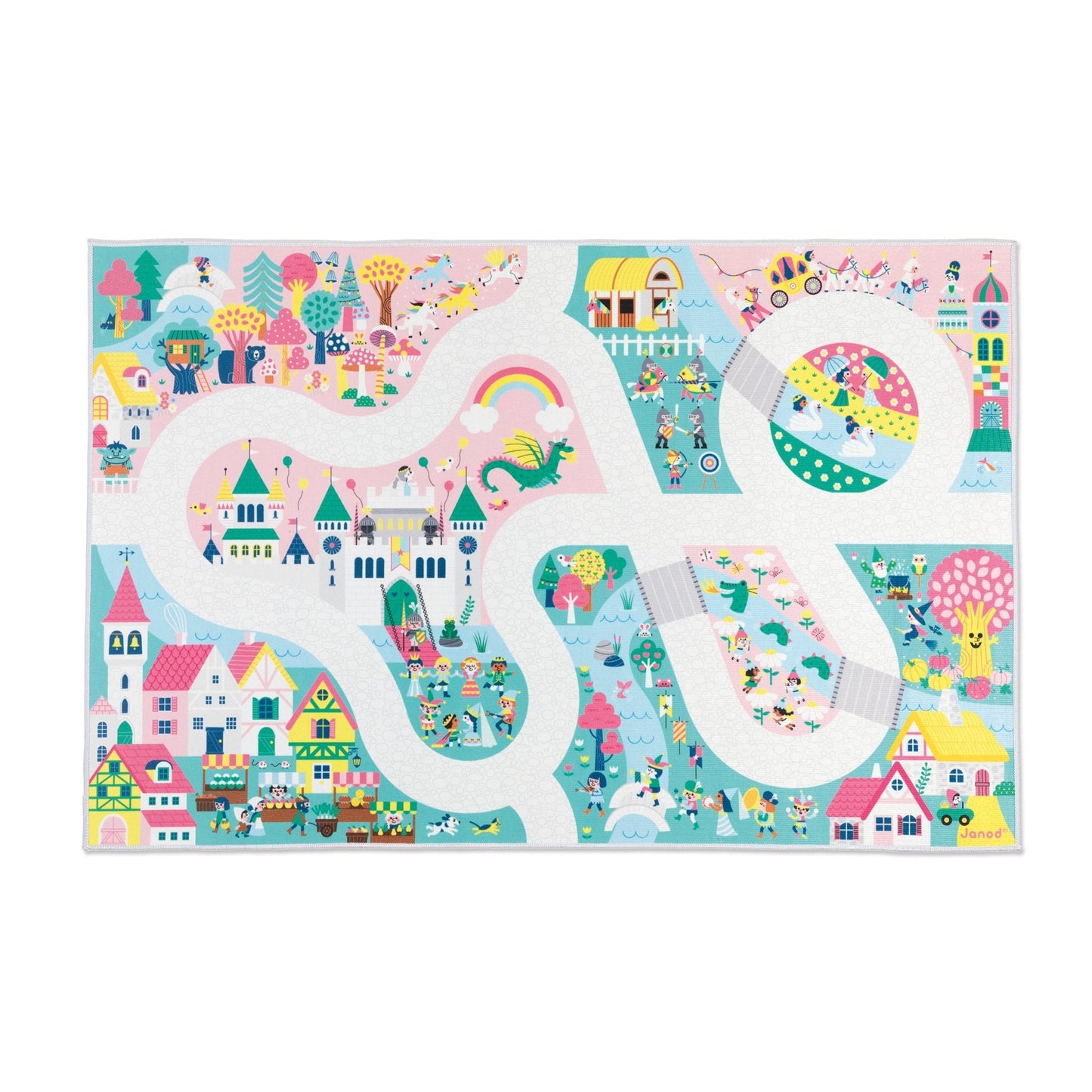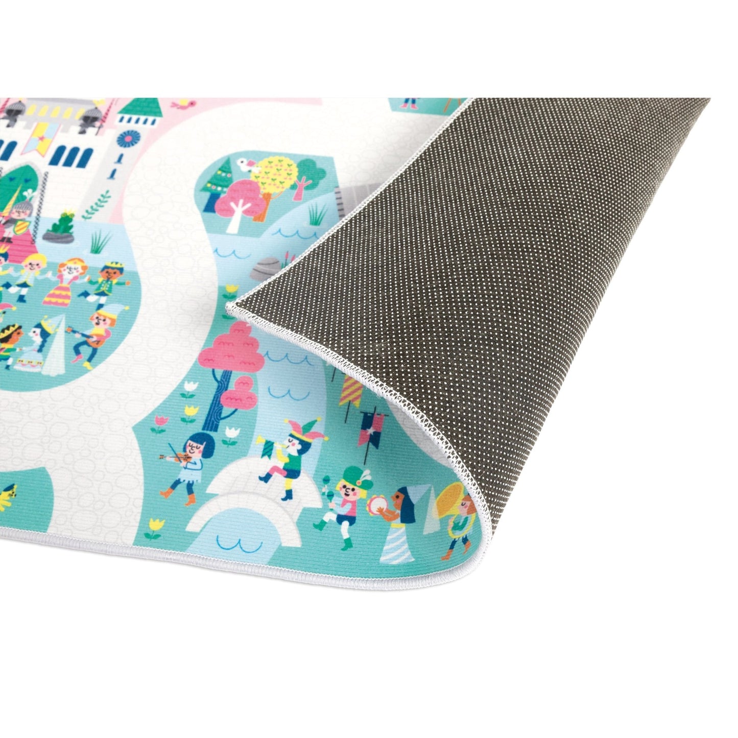 Discover the enchanted kingdom! The magic of fables comes to life in this fantastic, tangy setting! This Princess, Princes, Dragons and Knights playmat is suitable for children aged 2 and over. It has a wide, long road to discover every corner of the kingdom and imagine endless stories! On their play mat with circuit, little ones have fun crossing bridges and paths in search of hidden elements, like a search and find game. They'll spot where the king's trumpet is, the unicorns galloping across the pink plain, and keep an eye out for the strange wizard preparing a potion in the forest... There are so many buildings, musical instruments and fairytale characters represented! We pay a courtesy call on the troll who lives near the tree house, then head off to watch the jousting tournament, before heading to the market to stock up on magical ingredients. With their fabric play mat, children develop their imagination and vocabulary, as well as their sense of observation. Little ones can even discover emotions and numbers! Another plus for this children's play mat: it's non-slip! Perfect for rolling toy cars on, or simply for little ones who like to keep on the move. In its 120 x 78 cm format, this children's bedroom mat offers other play possibilities with its accessories (sold separately): it can be completed with a range of vehicles and wooden blocks, also from our Cross Roads range. You can also link this Enchanted Kingdom mat with other mats in the collection, to create a giant play area and extend children's adventures. In fact, the circuits are designed to link up on all 4 sides of the mat. Why not spend the evening in the fairy forest to round off the day in style?