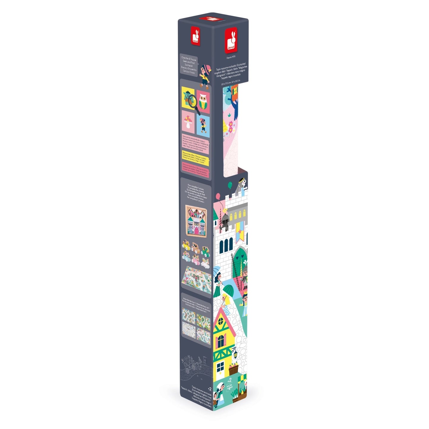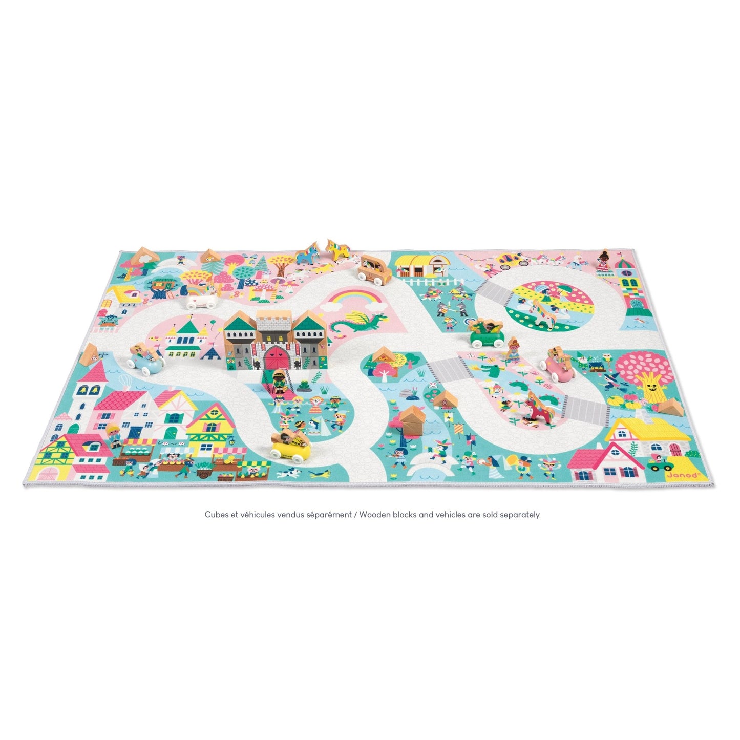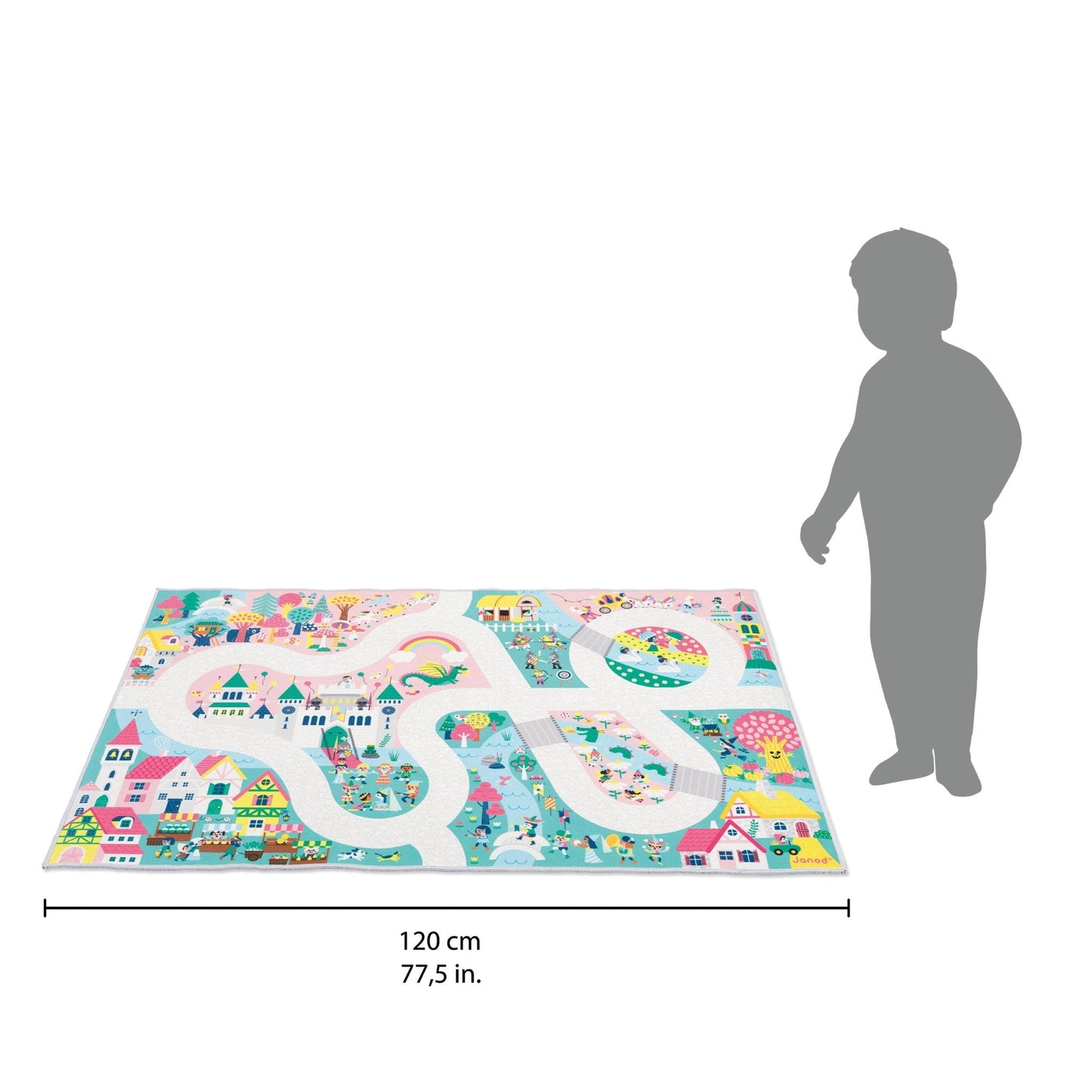 Discover the enchanted kingdom! The magic of fables comes to life in this fantastic, tangy setting! This Princess, Princes, Dragons and Knights playmat is suitable for children aged 2 and over. It has a wide, long road to discover every corner of the kingdom and imagine endless stories! On their play mat with circuit, little ones have fun crossing bridges and paths in search of hidden elements, like a search and find game. They'll spot where the king's trumpet is, the unicorns galloping across the pink plain, and keep an eye out for the strange wizard preparing a potion in the forest... There are so many buildings, musical instruments and fairytale characters represented! We pay a courtesy call on the troll who lives near the tree house, then head off to watch the jousting tournament, before heading to the market to stock up on magical ingredients. With their fabric play mat, children develop their imagination and vocabulary, as well as their sense of observation. Little ones can even discover emotions and numbers! Another plus for this children's play mat: it's non-slip! Perfect for rolling toy cars on, or simply for little ones who like to keep on the move. In its 120 x 78 cm format, this children's bedroom mat offers other play possibilities with its accessories (sold separately): it can be completed with a range of vehicles and wooden blocks, also from our Cross Roads range. You can also link this Enchanted Kingdom mat with other mats in the collection, to create a giant play area and extend children's adventures. In fact, the circuits are designed to link up on all 4 sides of the mat. Why not spend the evening in the fairy forest to round off the day in style?