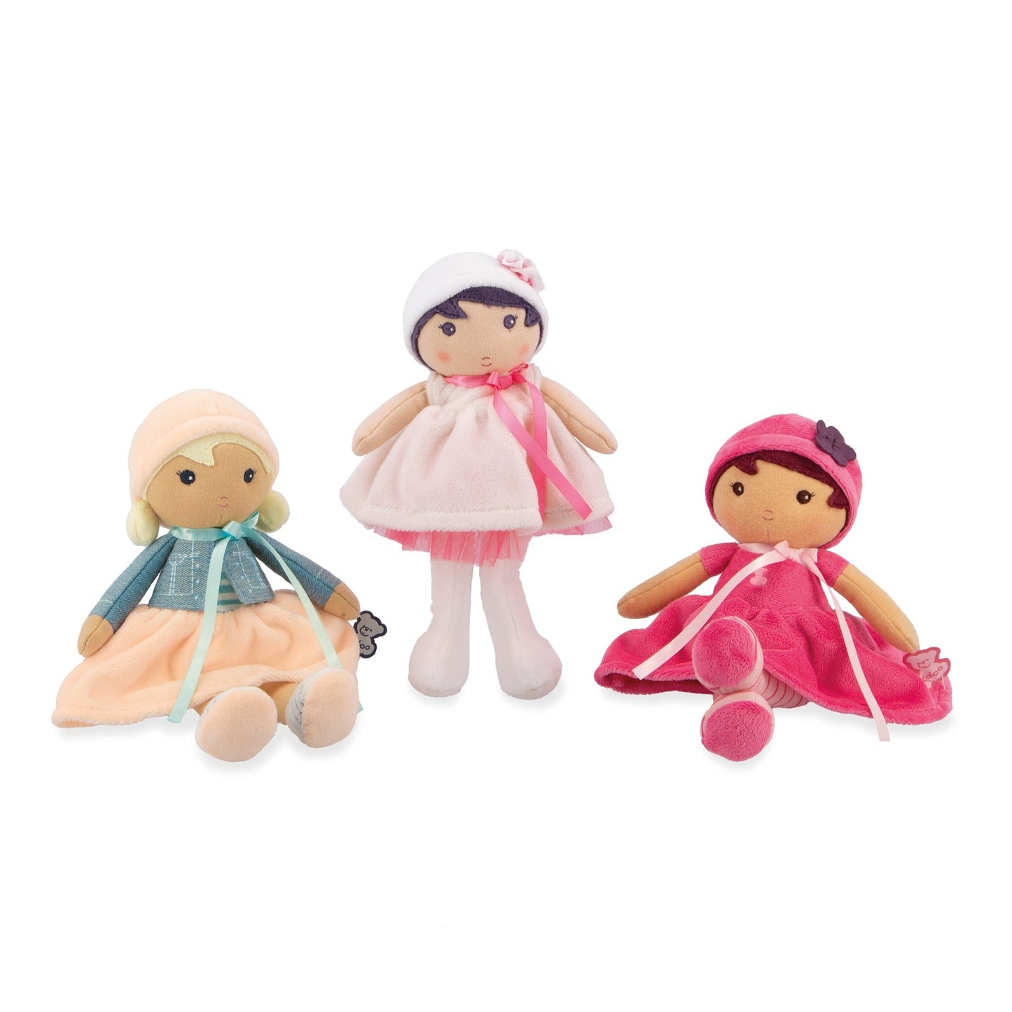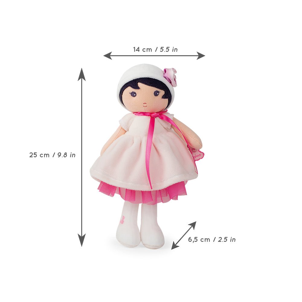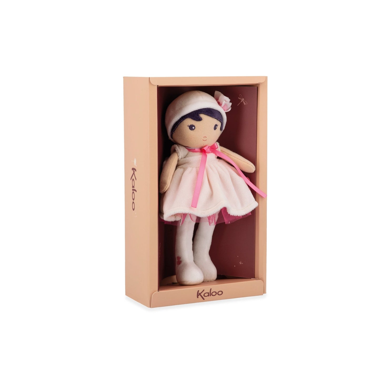 Perle K is all tenderness and elegance. The most gentle of the family, she is like a princess wearing a tulle skirt and pretty flower on the head. With her gentle smile and kind look, she will always be close to your little one to comfort her when she is sad. The iconic Kaloo bear is embroidered on her feet, making her even more unique. Write your daughter’s name on the long ribbon on the back of the doll to make her easily recognizable. 25 cm, usable from birth, machine washable, presented in a beautiful open box (16 x 7.5 x 29 cm)