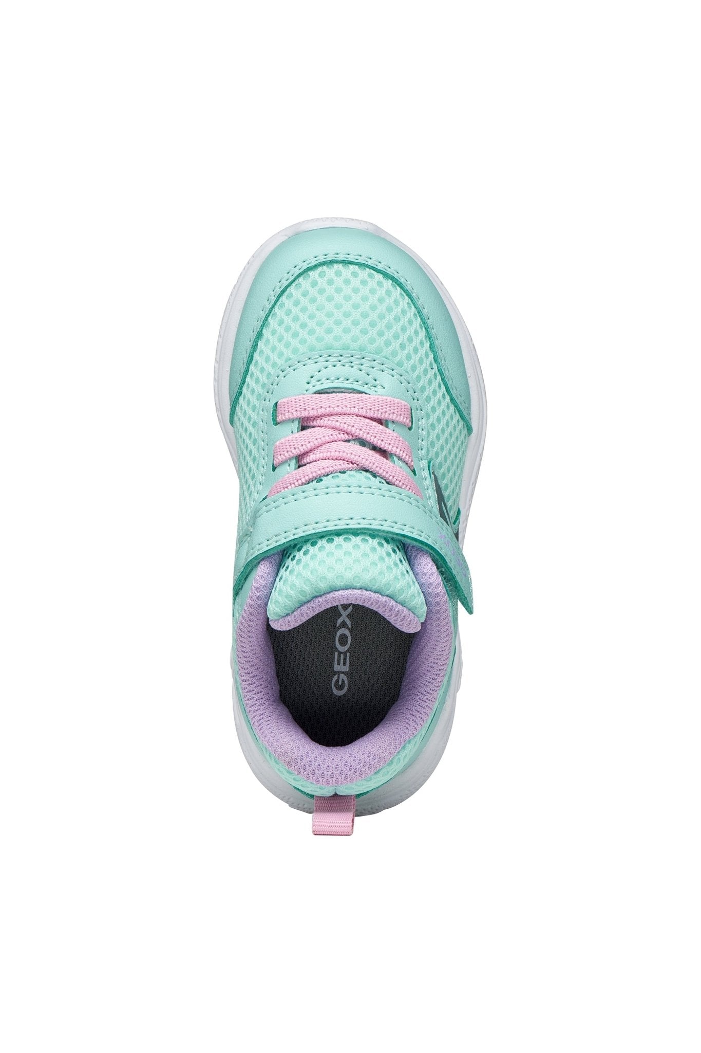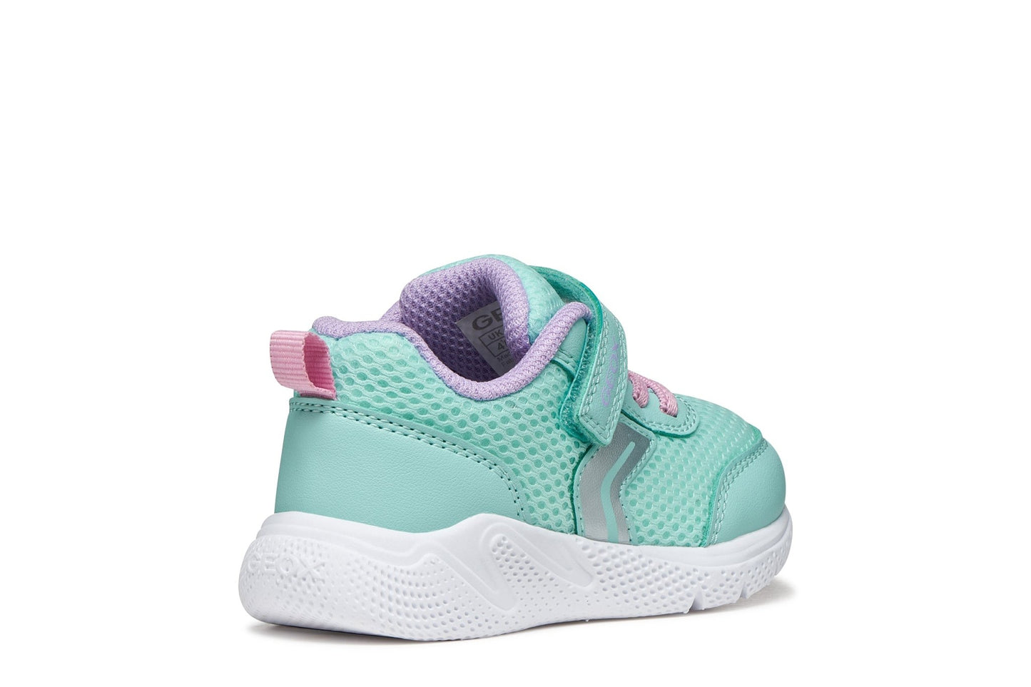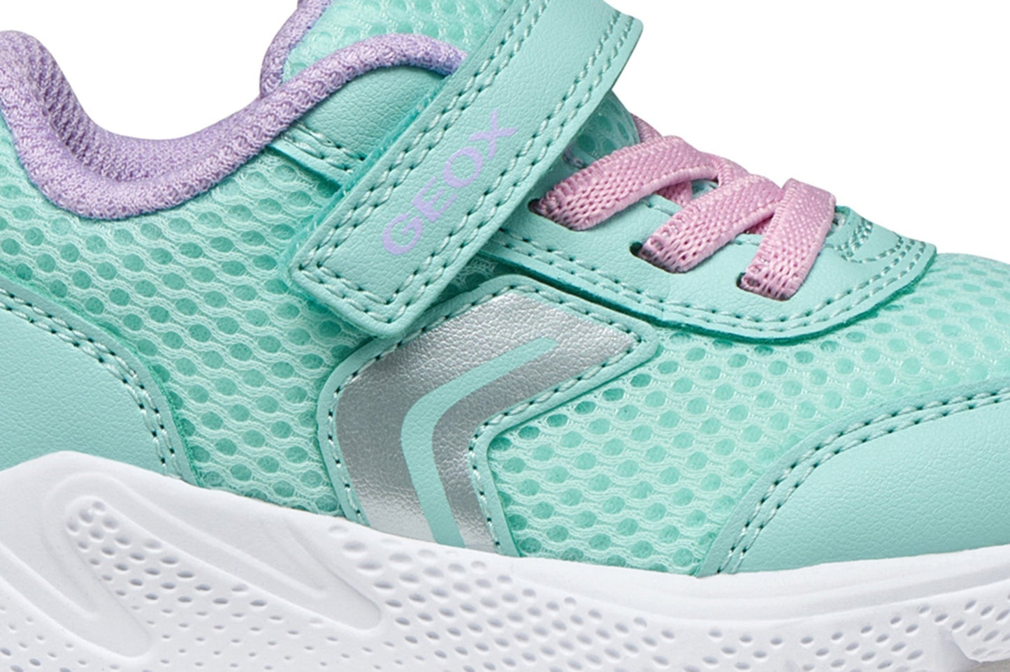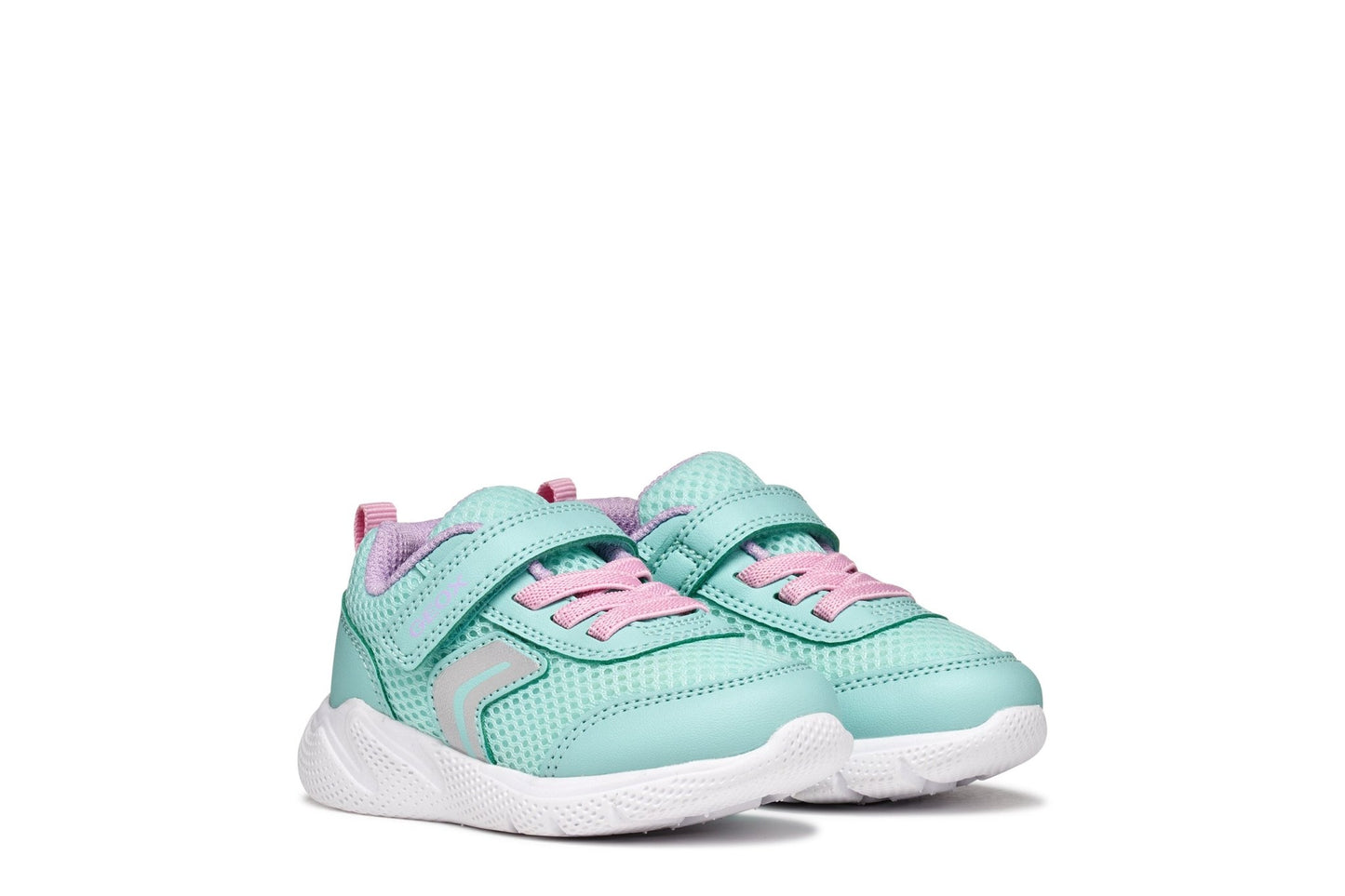 Watersea teal and pink Geox Sprintye baby sneakers with breathable mesh, leather‑effect upper, cushioned running‑style outsole, and easy strap‑and‑elastic fastening.